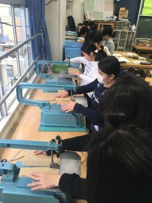 「ズラシックパーク」木を使った立体作品を製作しています。真っすぐ切る事が得意なのはのこぎり、曲線を切る事が得意なのは糸のこぎりという事を知り、2種類の木と2種類の道具を使い分けます。電動糸のこぎりは5年生で初めて使う道具です。刃のつけ方から学び、ダンボールで着る練習をしました。