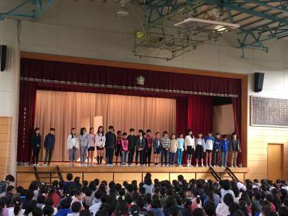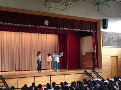 この劇なんでしょう集会でした。集会委員が演じる三匹の子豚や、ドラえもんなどを鑑賞し、タイトルをあてます。今年度最後のお楽しみ集会ということもあり、熱のこもった演技に、全校児童が楽しく参加しているようでした。