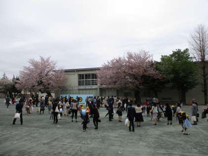 今、下校となって少しほっとした1年生たちが、校庭で、散りかけた桜の前で記念撮影をしています。