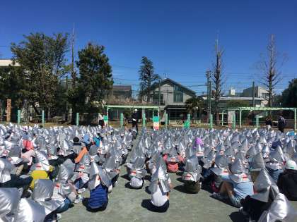 南側の民家で火災が起きたことを想定して避難訓練を行いました。一年生は、上級生の訓練に取り組む姿をけんがくしました。副校長先生からは3つお話がありました。大切なこと何が起きたのか、放送を聞いて自分で判断すること。先生の言うことをしっかり聞くこと。必ずハンカチを持つこと。この
