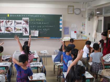 イタリアに関する知っていることや思っていることを自由に出させて、気持ちを高めます。先生が「みなさん、芸術家さんになってください」と投げかけると、子どもたちはやる気満々。ザリガニをよく見て、筆でのびのびと描きました。
