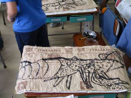 イタリアの新聞模様のクラフト紙を使い、ザリガニの絵をダイナミックに描きます。