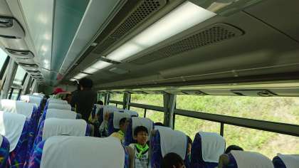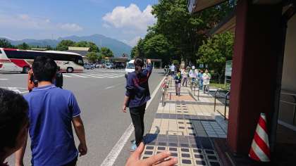 赤城高原SAでのトイレ休憩です。まわりの景色が変わってきたのをたのしみながら、またバスに乗り込んでふじやまビレジへ向かって出発です。