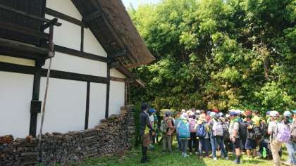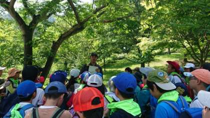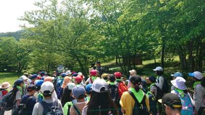 2つのグループに分かれてふじやまビレジの近くを散策しています。ガイドの方に里山についてお話しをしてもらいながらの、散策です。