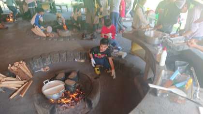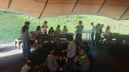 まだ日はたかいのですが、夕飯のカレー作りが始まりました。かまどに火をおこし、飯ごうでご飯を炊いています。