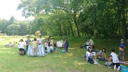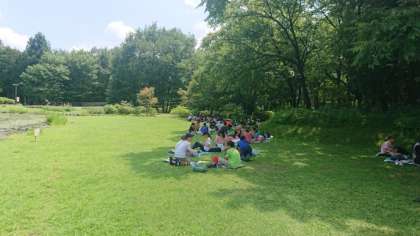 大谷川公園でお昼です。広い公園の中で、お弁当を広げているのは松原小学校だけです。木陰を選んで、班でまとまってお弁当を食べています。