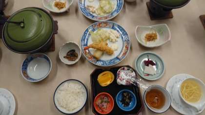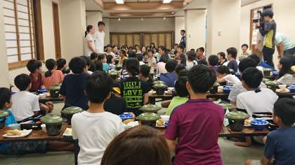 宿のご飯をいただきます。みんな自然と笑顔になります。楽しく食事しています