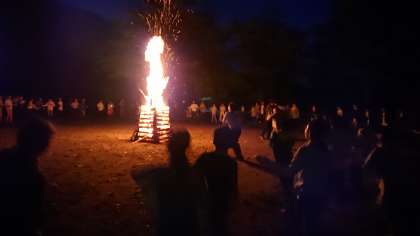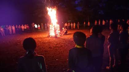 あたりが暗くなりキャンプファイヤーが勢いよく燃え上がりました。ダンスでみんなが一体となっています。