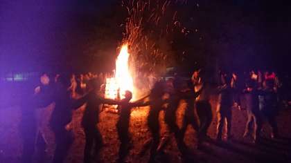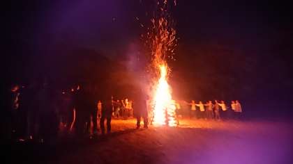 炎が生き物のように勢いよく空に上がり、みんなの気持ちも高まります。