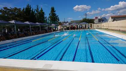 プールサイドにはったテントのなかから、大きな声援が続いています。