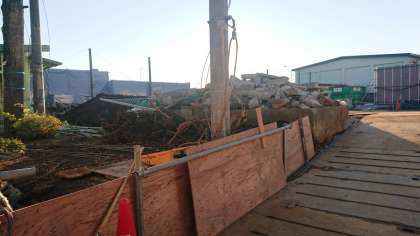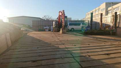 晴れて朝日があたっています。車両が入るところが作られて、工事が進んできたのがわかります。