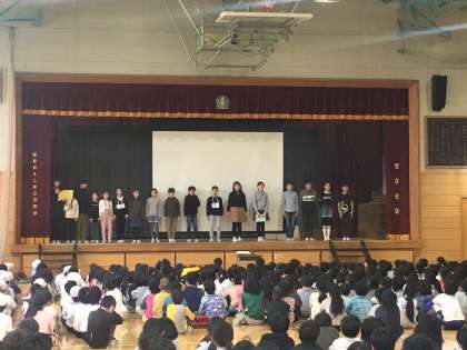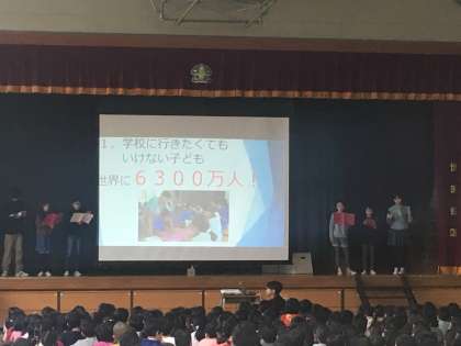 清潔な水を使えない人数や、医療の未発達の為5歳未満でなくなってしまう人数など、具体的な例をあげてそれに対して私達ができることは何か、全校児童が静かに聞き入っていました。私達ができることのうちの一つに募金があります。17日(金)-21日(火)の朝に