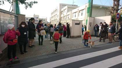 門の前で地域の方と一緒に大きな声で、おはようございますと声をかけています。なかにはまだ緊張して、声が小さい子もいますが、この経験を通してできるようになってくると思います。
