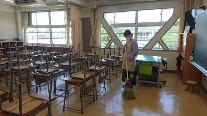 掃除をしてきれいになった教室に1人ぼっちの綿田先生。「一人で掃除をするのはさみしいな。早くみんなと掃除をしたいな〜」と改めて、みんなで掃除できる日が待ち遠しくなる綿田先生なのでした。