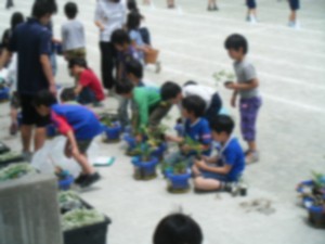 2年生では一人一鉢、ミニトマトの苗を植えました。