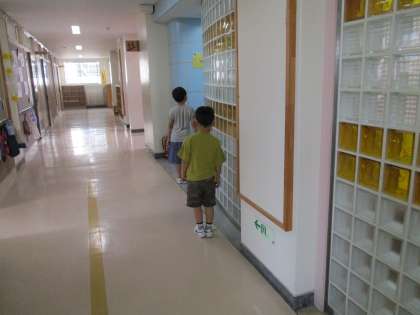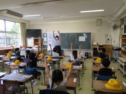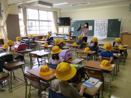 学校生活は集団で過ごすためのいろいろなきまりがあります。感染予防のための新しい学校生活のきまりも一緒に学んでいます。その一つとして校内のいろいろな場所に、3密にならないように、床には子どもたちが間を空けて並ぶためのマーキングがつけてあります。登校したての一年生もトイレに入るためのマーキングに沿って、しっかりと距離を保って並べています。ハンカチで手を拭いたりしまったりも、上手にできています。