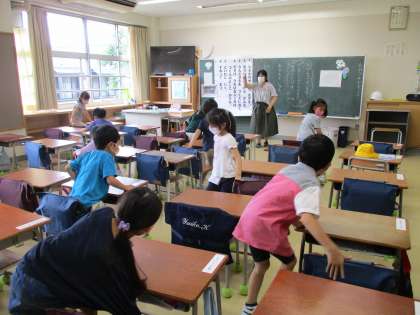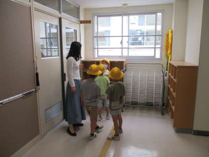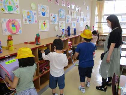 初めての学校生活では、覚えることがたくさんあります。自分のロッカーの場所を教わり、ランドセルや黄色い帽子をしまっています。廊下にもロッカーがあるので、場所を確認しました。名前を呼ばれた時に椅子をしまって立つ練習にも、素早い動きでしようとしていました。