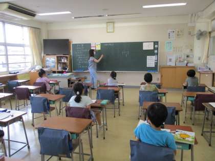 Bグループの2年生が算数の学習で、ノートの書き方を聞いた後、問題の答えをどのように求めるか、自分の考えをまとめています。自分の考えを説明したり、友達の考えを聞いて考えたりすることで、学習への理解を深めています。