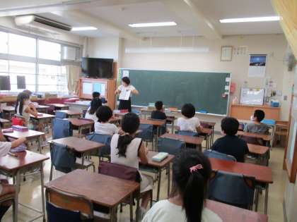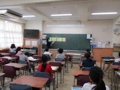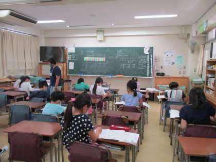 4年生Bグループの子どもたちが登校してきた昼過ぎは、今年初めての真夏日の予報通り大変暑くなりました。教室はエアコンを使用すると同時に感染防止のため、換気も行っています。大きな数の復習では、国家予算に出てくるような大きな数を扱うため、たくさん0のついた数を何度も数えて、答えを求めていました。