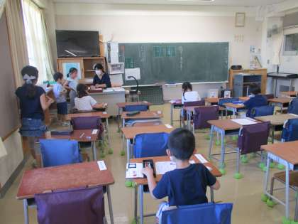 午後に登校してきた1年生Bグループの子どもたちも、ワークシートをうまく押さえる手の置き方を聞いて、上手なひらがなの文字を書く学習に取り組みました。ゆっくりと「かたつむりの線」で書くことで、とてもよい字が書けるようになりました。