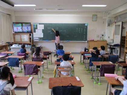 1年生はひらがなの学習をしたり、算数の教科書を使った学習に取り組んだりしました。絵を見ながら「前から3匹目」と「前から3匹」の違いを考えています。