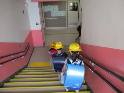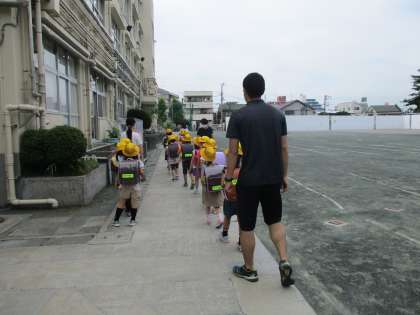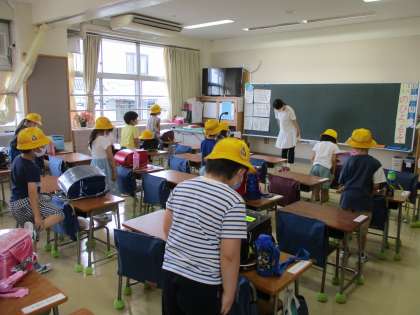 1年生の下校の様子です。あいさつをしてから班ごとに分かれて廊下に出て、靴を履きかえた後、校庭に並びます。自分の班を覚えて、同じ班の友達がだんだんと誰なのか分かってきました。下校の時も友達との距離を保って歩けるように、「離れましょう」と声をかけています。