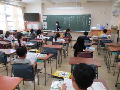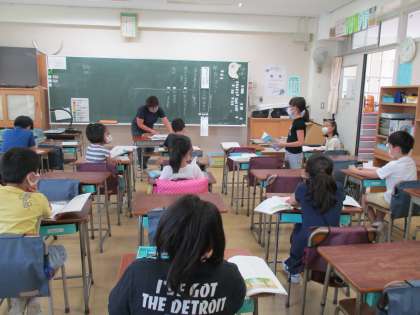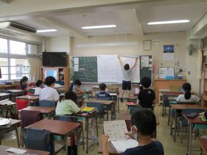 4年生は、国語の「白いぼうし」のクライマックスの場面で「あの女の子は何者だったのか」を話し合っています。自分の考えを発表しながら、その根拠となった叙述を他の友達と一緒に確かめました。友達の発言に「同じ、私もそう思った」とのつぶやきが聞かれました。