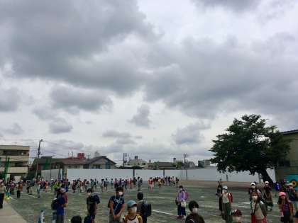 感染リスクから児童を守るため、検温してから登校する、密集しないように間隔をあけて校舎へ入る、水道やトイレに並ぶ時は目印のテープのところで待つ、など新しい決まりが増えました。