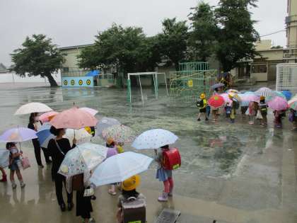 1年生の集団での下校は今日までです。傘をさして歩くときは、視界が狭くなるので、いつも以上に周りの状況を確認しながら安全に登下校できるように指導していきます。
