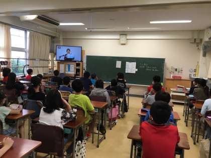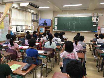 今日から通常登校です。感染予防のためテレビ放送で全校朝会を行いました。