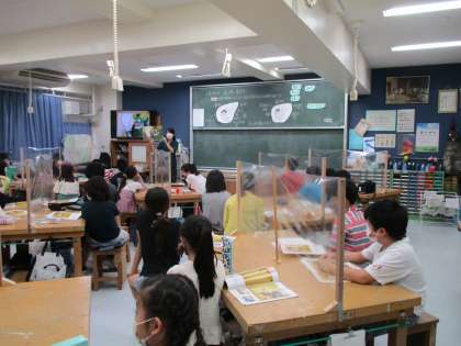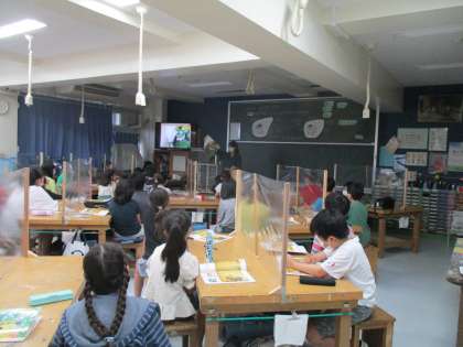 5年生が俵屋宗達の「風神雷神図屏風」を見ながら、イメージを膨らませて自分なりの絵に描く学習に取り組んでいます。描く画用紙も、屏風絵の感じが再現できるように、2種類の薄い茶色の画用紙から選びます。作業の進め方の説明を聞きながらどんな絵にしようかと一人ひとり考えています。