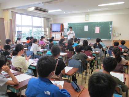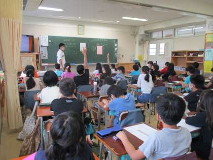 プリントを使って5年生が体積の学習の復習をしています。クラス全体が静かにしているとき、最初に手を挙げて発言するには、思い切って言おうとする気持ちが必要な時もあります。口火を切って発言した友達の気持ちを担任が汲んでクラスに伝えたところ、次々と手が挙がるようになりました。すぐに「自分も」と言われたことを取り入れて、行動に移せることが素敵だなと思いました。