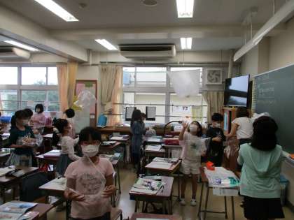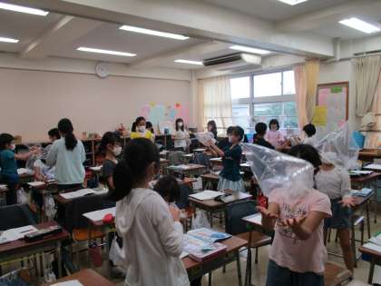 4年生が「空気と水」の学習で、「空気」の性質を調べるために、ビニール袋に空気を閉じ込めようとしています。ぱんぱんにふくらませることができたと輪ゴムで止めるうちに、空気が抜けてしまって、なかなかうまくいきません。