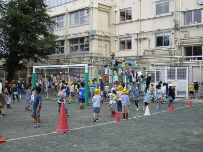 黄色い帽子の1年生も昼休みの校庭遊びを楽しんでいます。ジャングルジムやうんていが人気です。1年生のお世話を教室にしにいくことはできないですが、休み時間なら一緒に遊べます。