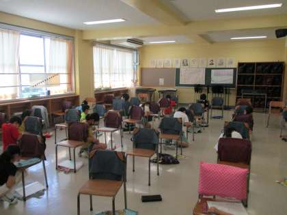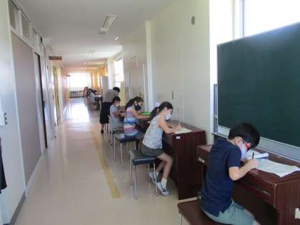 音楽の授業で、ドレミで書かれたものをみて、音符で書き表すワークシートに取り組んでいます。1クラスの半分の子どもたちは、教室は自分の座っている椅子を机に、残りの半分の子どもたちは、廊下の机などを使って書き込んでいます。3密を避けるための対策です。
