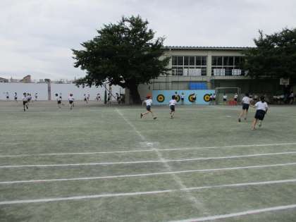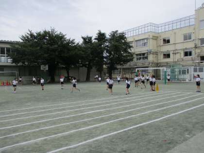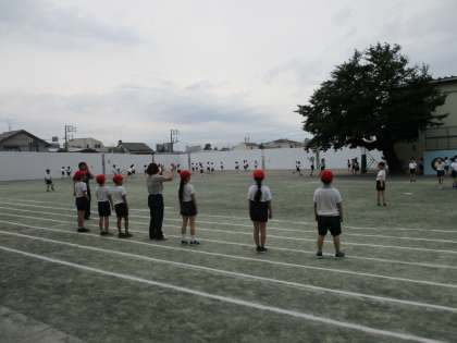 4年生は学年全員で体育の授業を受けています。3クラスいっぺんに走り回れるのも、校庭が広い今だからこそです。タッチができないので、紅白帽を使ったしっぽ取りをしています。赤い帽子の鬼から逃げていたら、「先生も鬼だよ」と追いかけられて、慌てて逃げ回っています。