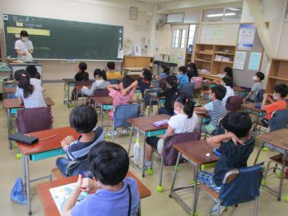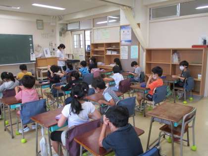2年生の算数では「長さ」について勉強しています。ものさしを見ながら、1センチメートルや1ミリメートルは実際にどの長さを指すかを確認した後は、今日の学習「ものさしを使って、まっすぐな線をかく」ことに取り組みます。