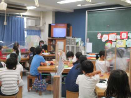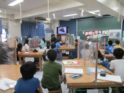 焼き物のメダルづくりの説明を聞いています。砕いたガラスをのせて焼くとどのようになるか、実物を見せてもらっています。色付きガラスのため、グラデーションをつくることもできます。どのようなメダルが生み出されるのか楽しみです。