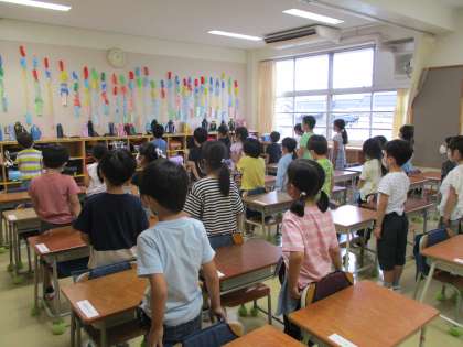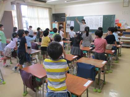 松原小学校の校歌の歌詞を覚えようと一生懸命です。後ろを向いて歌詞の書かれた紙を見ないで歌おうと頑張っています。