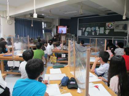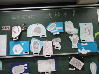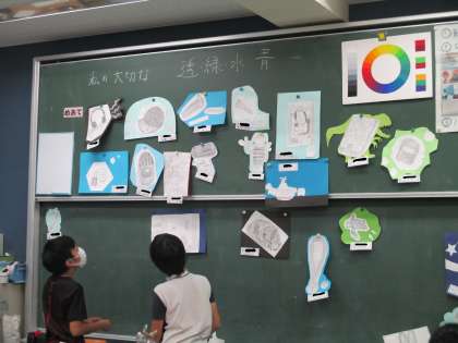黒板には登校再開後に取り組んだデッサンが貼られています。鉛筆の濃淡で立体的に見えるように影をつけたり、指で鉛筆で描いたところをこすったり、細部まで観察して描きこんだりしていて、思いのこもった見事な作品には目が引き寄せられます。台紙の形にも工夫が見られ、作品鑑賞がよりいっそう楽しい時間になっています。