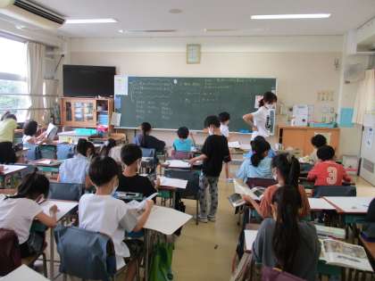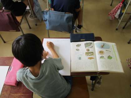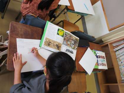 学習課題「昆虫はどんなところに住み、どんな体のつくりになっているか」に取り組んでいます。思い思いの大きさの画用紙に、図鑑を見ながら絵や文でまとめています。自分の選んだ昆虫について、ダイナミックにまとめる様子が、そこかしこで見られます。