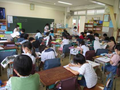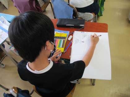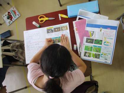 「こん虫はどんなところに住み、どんな体のつくりになっているか」の学習の続きをしています。図鑑を使っての調べ学習に意欲的に取り組んでいます。カラーコピーしたものをうまく活用する子や2枚目の紙をもらって書いている子もいます。