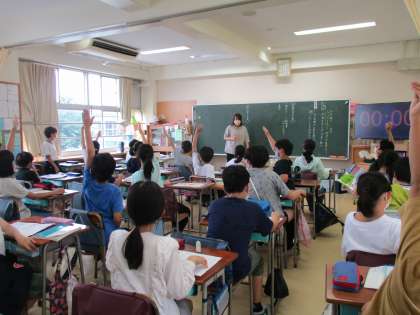 「だれもがくらしやすい町へ」の学習で、「くらしの中の工夫をみつけてしらべたいことを決める」学習課題に取り組んでいます。学校の中の工夫を実際に校舎内を歩き回って調べた後、相互氏名で発表しています。たくさん手が挙がっています。