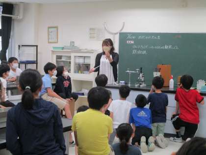 めだかの誕生の学習で、顕微鏡の使い方の説明を聞いています。顕微鏡で見る時の手順やプレパラートを対物レンズで割らないようにするピントの合わせ方、液体を見る時はどうするかなど、一つ一つの説明をしっかり聞き、自分でもやってみようとしています。