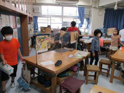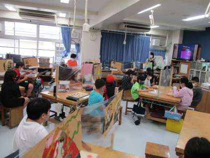 風神、雷神の絵が仕上がり、パーテーションにクリップで留めて、お互いに見合っています。