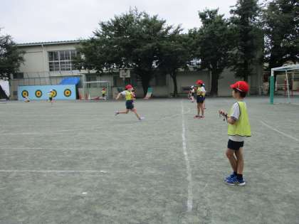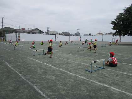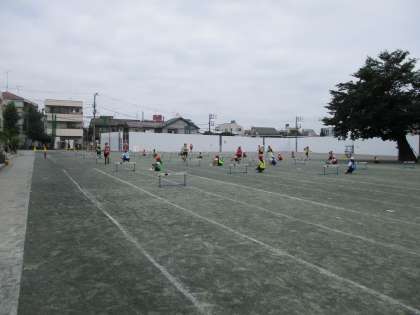 5年生はハードル走でタイムを計っています。リズムよくハードルを跳び越し、最後はゴールに走り込んで、よいタイムを出そうとしています。