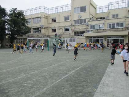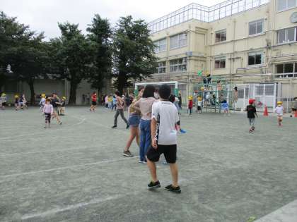 今日は昼休みも外で遊ぶことができました。二人でボール遊びをしていますが、使っているボールは2個で、お互いが同時に相手に投げ、相手からのボールを受け取ろうとしていて、とても難しそうです。