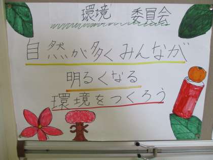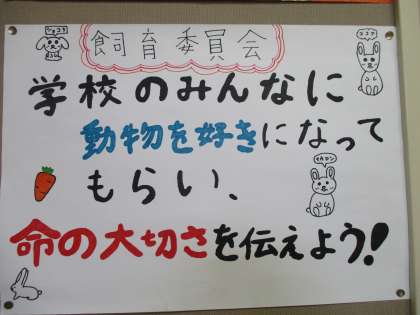 飼育委員会、環境委員会のポスターです。ポスターに込めた委員会の委員の子どもたちの思いが全校の子どもたちに伝わってほしいです。