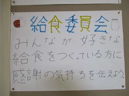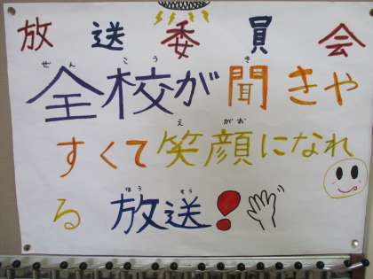 給食委員会、放送委員会のポスターです。毎日の栄養黒板の表示を替えたり、お昼の放送を流したりして、書かれた目標の活動を続けています。