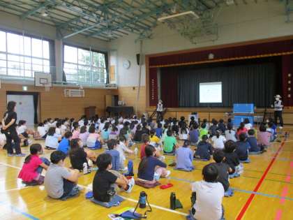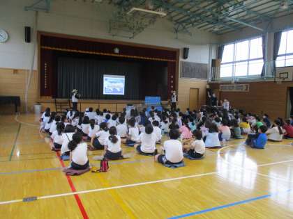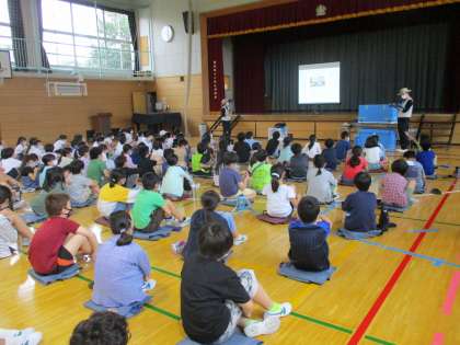 東京都水道局の方が来校し、水道キャラバンの学習をしています。災害時はどこに行けば水を得られるか、一日に人が必要な水分量はどのくらいか、昔の水道はどのようになっていたのかなど様々なお話を伺ったり、水をきれいにする実験を見たりしました。